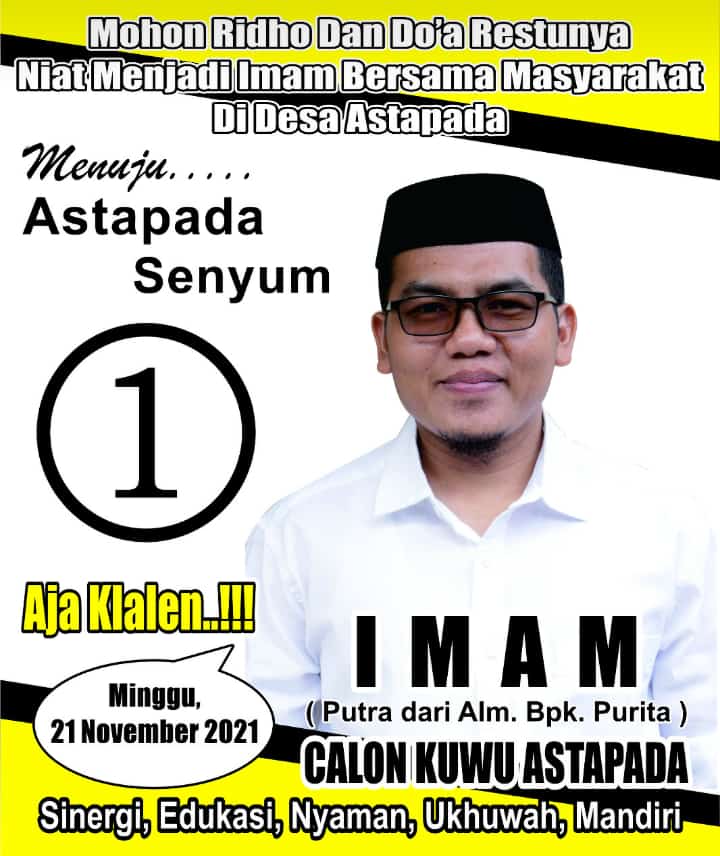 Salah satu calon kuwu desa Astapada Kecamatan Tengah Tani Kabupaten Cirebon, Imam dengan nomor urut 1, mohon ridho dan doa restunya, niat menjadi Imam bersama masyarakat didesa Astapada.