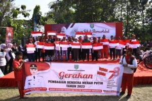 Bertempat di Lapangan Bola Rema Pelangi Desa Cangkingan Kecamatan Kedokan Bunder, Nina Agustina membagikan bendera merah putih secara simbolis kepada jajaran TNI, Polri, ASN, kepala desa, dan perwakilan masyarakat untuk selanjutnya dipasang di berbagai tempat selama bulan Agustus sebagai bulan kemerdekaan.