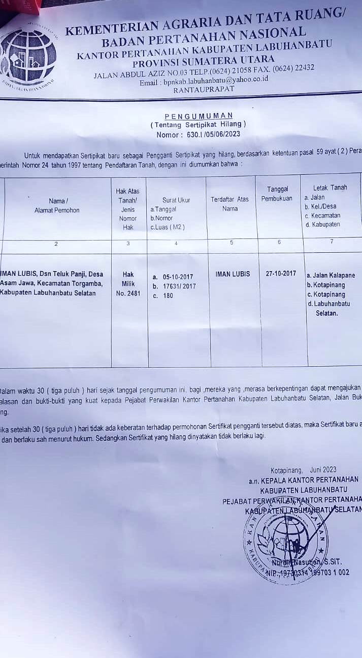 Tentang terjadi kehilangan Sertifikat Tanah N0 630./05/06/2023 . Atas Nama IMAN Lubis alamat Dusun Teluk Panji Desa Asam Jawa Kecamatan Torgamba Kabupaten Labuhanbatu Selatan.
