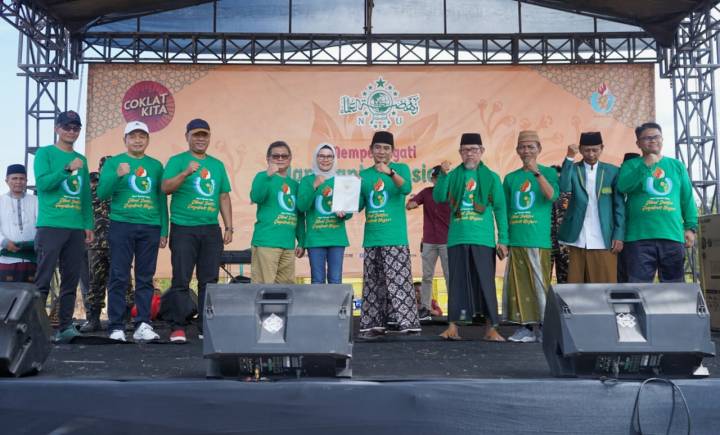 Pada kesempatan itu juga, Bupati Indramayu Hj. Nina Agustina menyerahkan sertifikat waqaf kantor PC NU Kabupaten Indramayu yang dilanjutkan dengan pelepasan jalan santai dan peninjauan ke stan UMKM dan berbagai pelayanan terpadu lainnya. (Duliman)