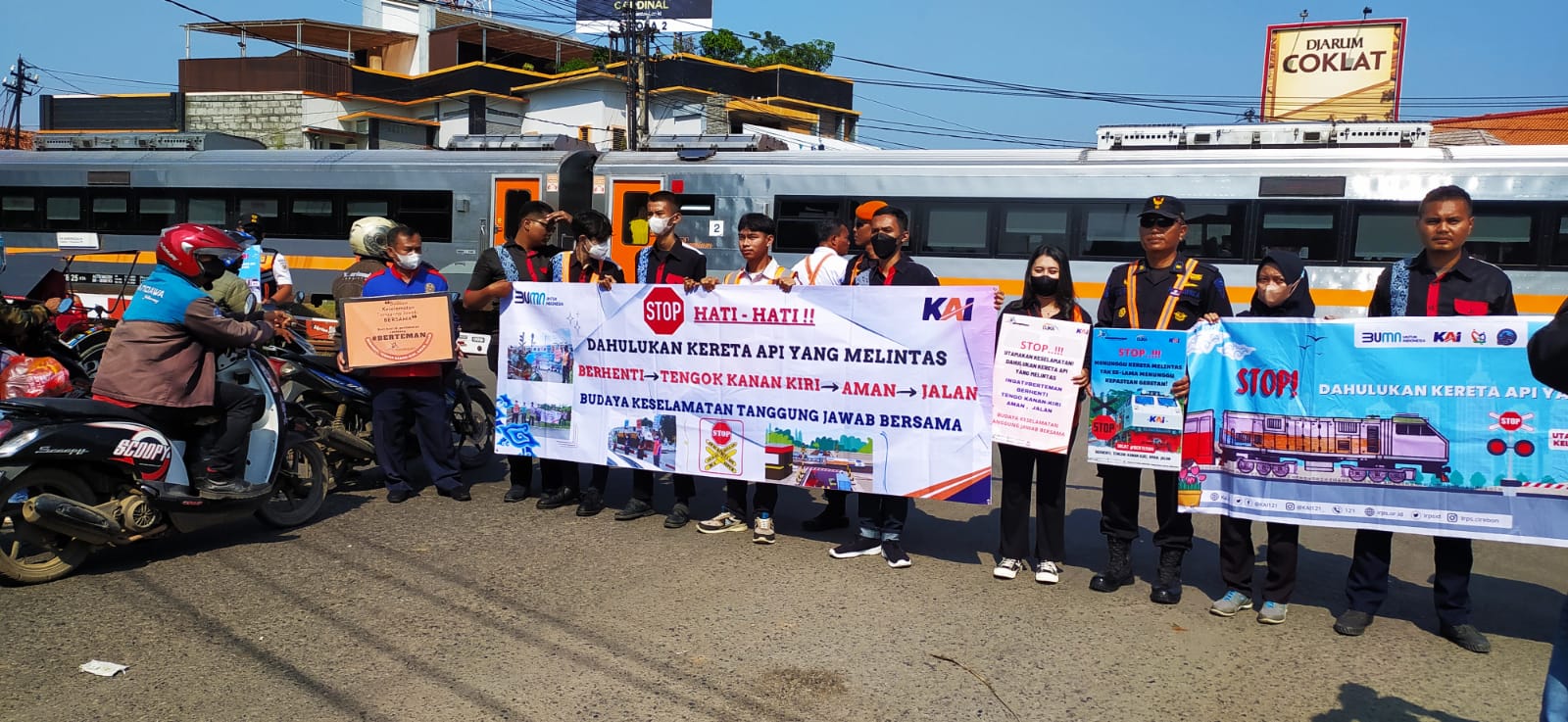 Kegiatan sosialisasi diisi dengan membentangkan spanduk himbauan keselamatan, pemberian flyer keselamatan, serta merchandise kepada para pengguna jalan yang melewati pintu perlintasan tersebut. Dengan tagline “BERTEMAN” (Berhenti, Tengok Kanan-Kiri, Aman, Jalan) diharapkan hal tersebut menjadi perhatian para pengguna jalan raya, mengingat saat ini arus lalu lintas kendaraan lebih padat dan kecepatan perjalanan kereta api 120 km/jam.