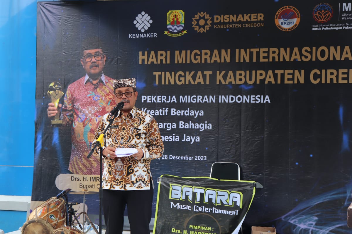 Bupati Cirebon Drs. H. Imron, M.Ag, menghadiri acara peringatan Hari Migran Internasional tahun 2023, yang diselenggarakan dihalaman gedung Layanan Terpadu Satu Atap ( LTSA ) Kota Cirebon, Kamis ( 28/12/23 ).