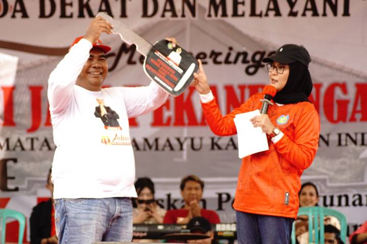 Merayakan Hari Jadi Ke-41 Desa Pekandangan Jaya Kecamatan Indramayu, Bupati Indramayu Nina Agustina ‘sawer’ mobil siaga untuk kebutuhan masyarakat.
