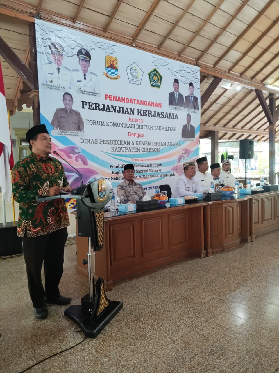 Penandatanganan nota kesepahaman ( MoU ) ini berlangsung pada Kamis ( 19/6/25 ) bertempat di Pendopo Bupati Cirebon dan dihadiri langsung Bupati Cirebon H. Imron, Kepala Dinas Pendidikan Kabupaten Cirebon H. Ronianto, Kepala Kementerian Agama Kabupaten Cirebon dan Ketua DPAC FKDT Kecamatan se Kabupaten Cirebon serta tamu undangan lainnya.