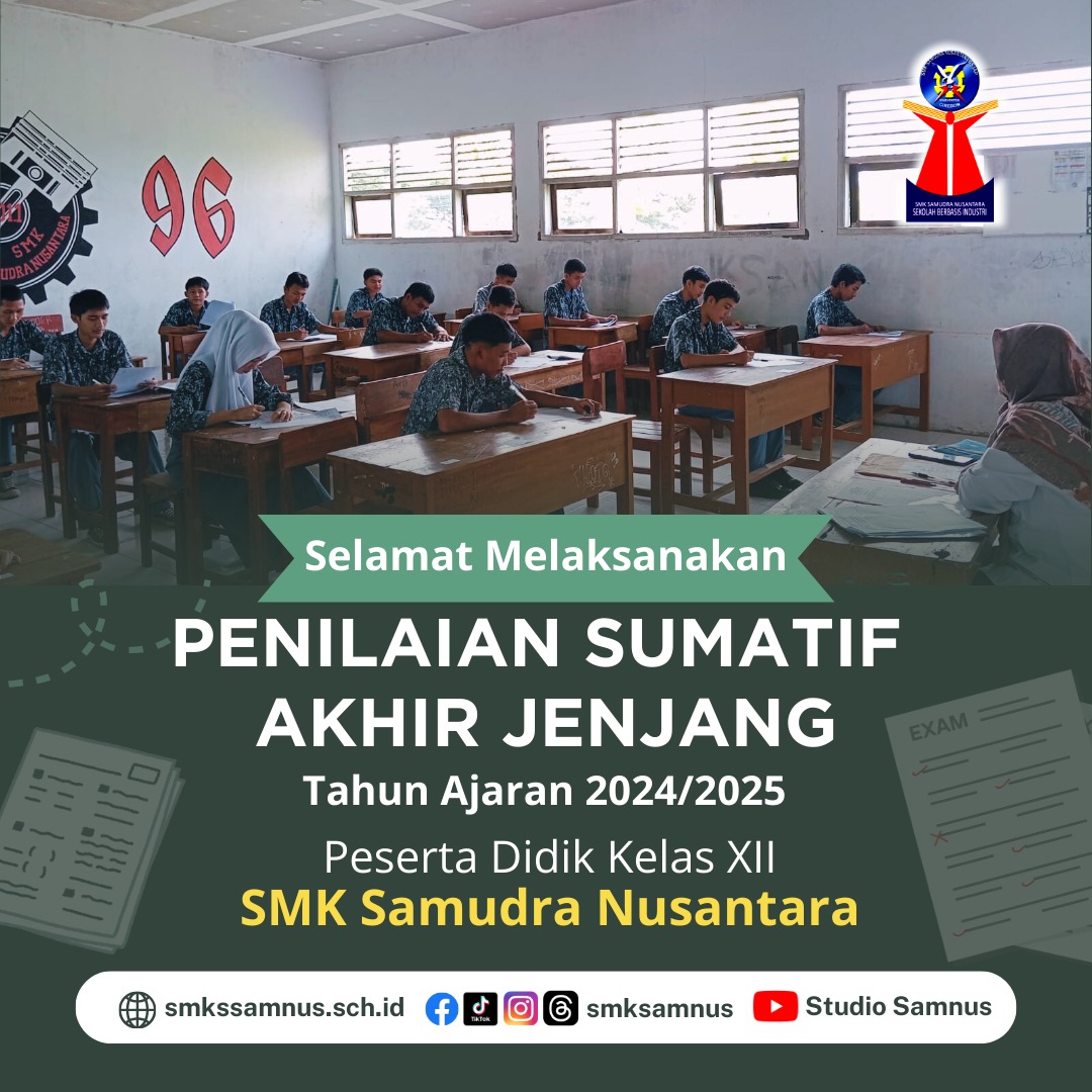 Wakasek Kesiswaan SMK Samudra Nusantara Asjap, Ruly Budhiyanto, ST mengatakan, untuk jadwal Ujian Penilaian Sumatif Akhir Jenjang Tahun Pelajaran 2024/2025 ini terdapat 6 mata pelajaran yang di ujikan. Untuk hari pertama, para siswa dari 5 kejuruan mengikuti ujian mata pelajaran Pendidikan Pancasila dan Matematika. Pada hari kedua dilanjut dengan mata pelajaran Simulasi Digital (Office) dan Bahasa Inggris, hari ketiga di tutup dengan mata pelajaran Teori Kejuruan dan Bahasa Indonesia.