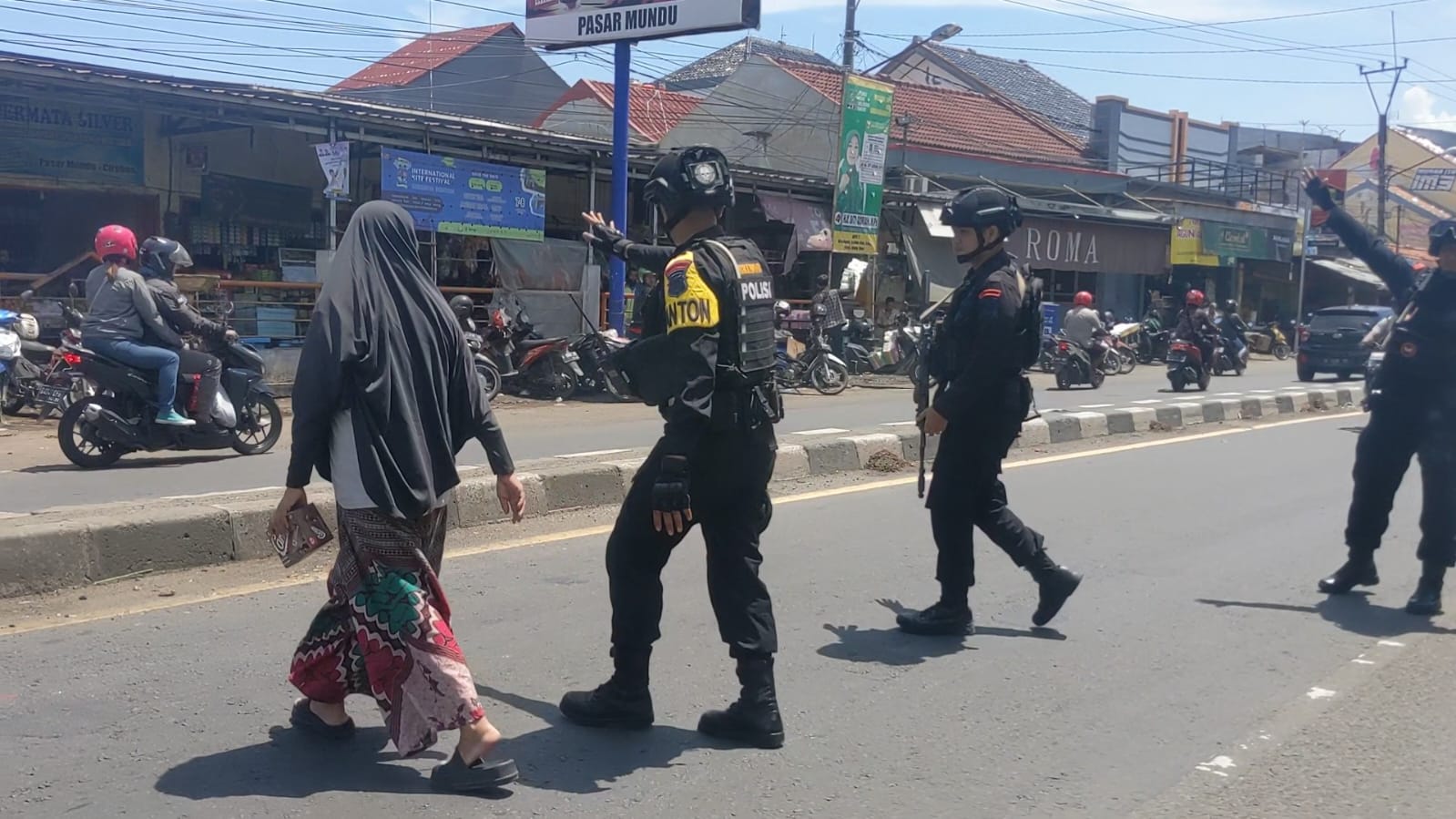 Terlihat seperti biasa arus lalu lintas di dominasi roda dua maupun empat cukup ramai sehingga untuk menjaga keselamatan masyarakat hendak menyeberangi jalan untuk menuju ke arah pasar, maka dengan sigap personil Kompi 1 Batalyon C Pelopor Satbrimob Polda Jabar, menghampiri masyarakat tersebut untuk membantu menyeberangi jalan.