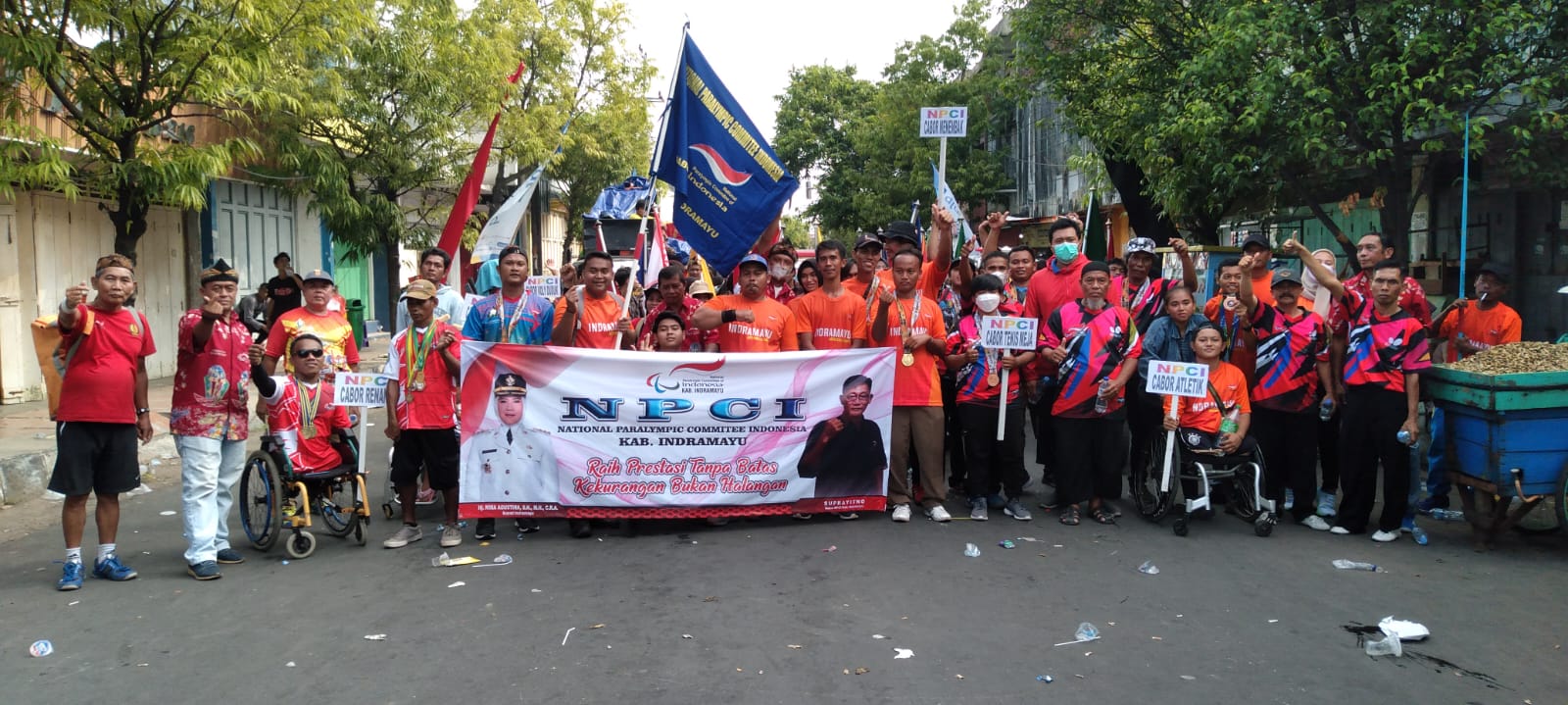 Puluhan atlet disabilitas yang tergabung dalam National Paralympic Committee Indonesia (NPCI) Kabupaten Indramayu ikut memeriahkan kirab dan karnaval budaya peringatan Hari Jadi ke 495 Kabupaten Indramayu 2022, Kamis (13/10/2022). Pengurus dan atlet disabilitas berbaur dengan barisan 27 organisasi perangkat daerah (OPD), 3 rumah sakit, 31 kecamatan, organisasi kepemudaan dan lainnya.