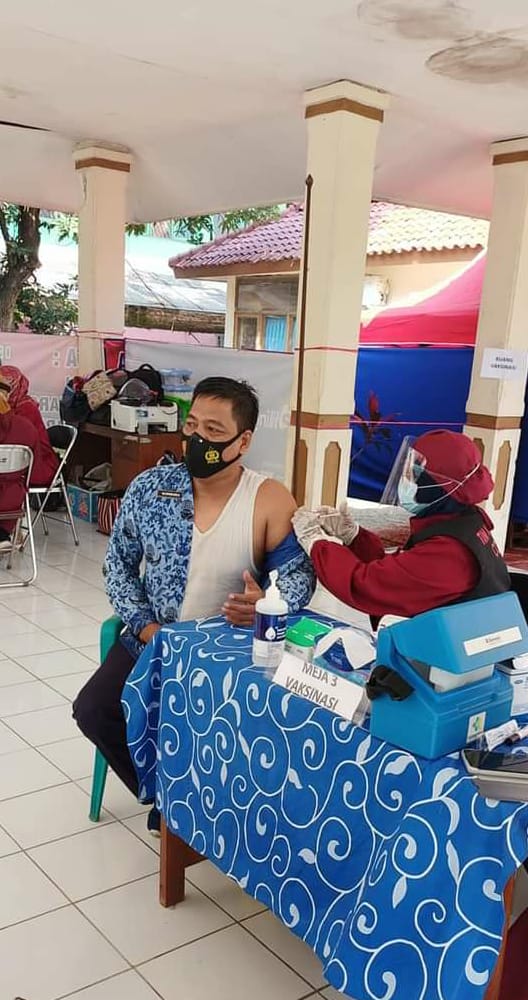 Kuwu desa Weru Kidul Nurwenda yang juga orang nomor satu di Pemdes Weru Kidul disuntik vaksin.