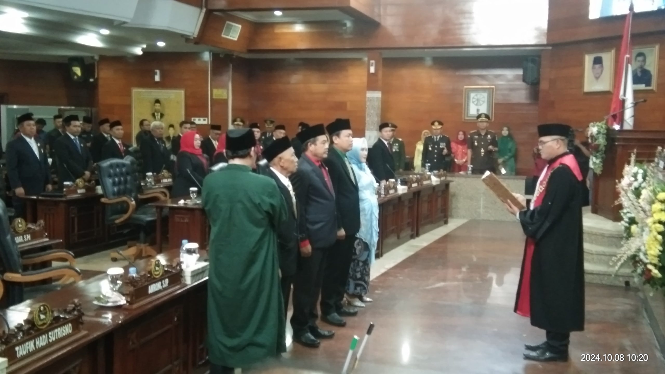 Pengucapan sumpah berlangsung lancar dengan diikuti oleh Ketua DPRD terpilih, Drs. H. Haryono, M.Si beserta Wakil Ketua DPRD H. Sirojudin, SP. MSi, Amroni, S. IP, dan Kiki Zakiyah, S.E.