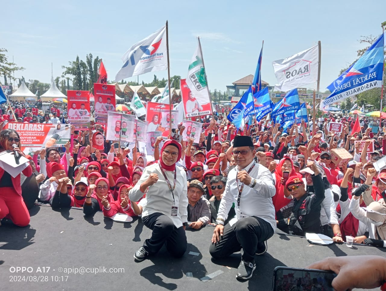 Pelita News I Indramayu – Ribuan masyarakat Indramayu mengawal pasangan calon Bupati dan Wakil Bupati Indramayu, Nina Agustina dan Tobroni yang diusung Partai Demokrasi Indonesia Perjuangan (PDIP), Partai Kebangkitan Bangsa (PKB), Partai Demokrat dan Partai Persatuan Indonesia (Perindo) ke KPU Indramayu, Rabu (28/8/2024). Mereka berduyun duyun dari berbagai pelosok Indramayu dan mendatangi titik kumpul di sport center (SC).